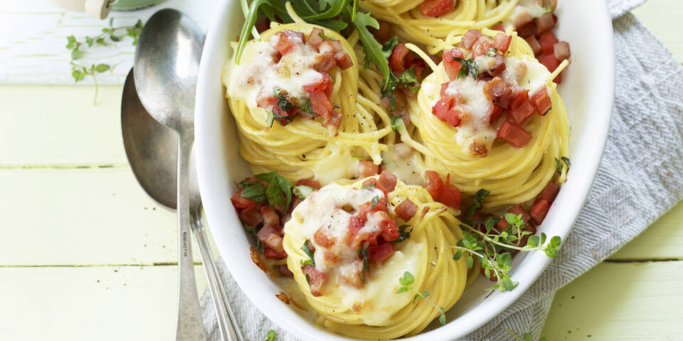 - Die Eier mit Obers verquirlen, etwas salzen und pfeffern und den Speck mit den Paradeisern und Mozzarella untermischen. Jeweils 1–2 EL der Käse-Speck-Mischung in die Öffnung der Nester verteilen und im vorgeheizten Ofen ca. 15 Minuten überbacken. Den übrigen Rucola auf Tellern verteilen und die Nudelnester darauf anrichten.