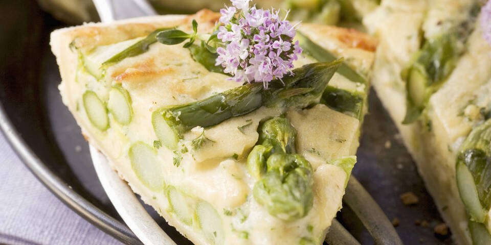 - Die Erdäpfel schälen, durch die Erdäpfelpresse drücken und ausdampfen lassen. Das Obers mit Crème fraîche, Eiern, Käse und Kräutern verrühren. Mit Salz und Muskat würzen und die Erdäpfel sowie den Spargel unterheben. Die Masse auf dem Teigboden verteilen und im Ofen 45 Minuten goldbraun backen. Mit Schnittlauchblüten garniert servieren.