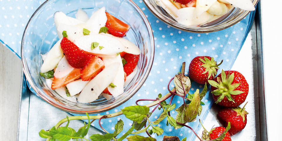 - Den Zitronensaft dazugeben, salzen und zugedeckt fünf Minuten mit leichtem Biss gar schmoren. Währenddessen die Erdbeeren waschen, putzen und je nach Größe halbieren oder vierteln.