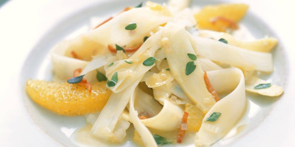 - Das Olivenöl erhitzen und die Spargelstreifen mit den Schalottenwürfeln sowie Peperonistreifen farblos anbraten. Mit Noilly Prat und Orangensaft ablöschen und einmal aufkochen lassen. Die Orangenfilets unterschwenken und mit Zucker, Salz und Pfeffer würzen und die kalte Butter in Flocken zugeben.