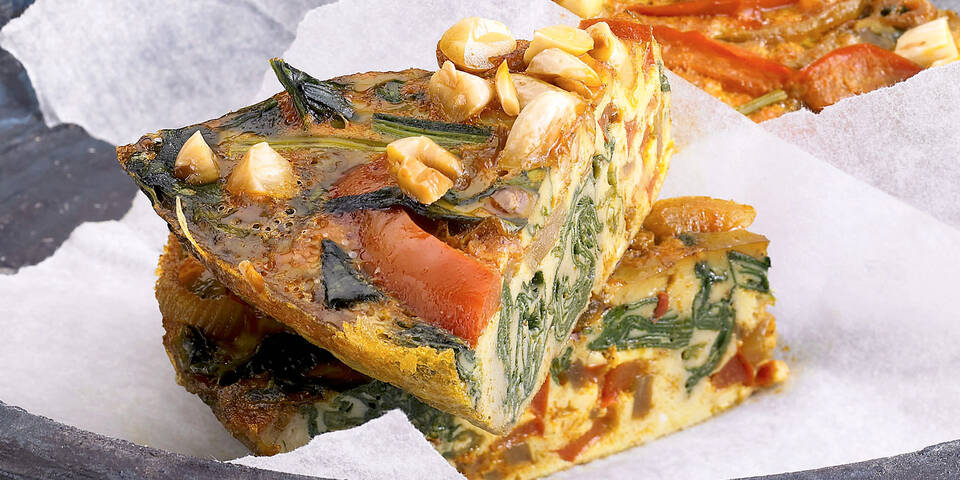 - In einer hohen, ofenfesten Pfanne die Butter zerlassen und die Zwiebel sowie den Knoblauch 1–2 Minuten glasig anschwitzen. Die Paprika und den Spinat zufügen und mit der Eiermilch übergießen.
