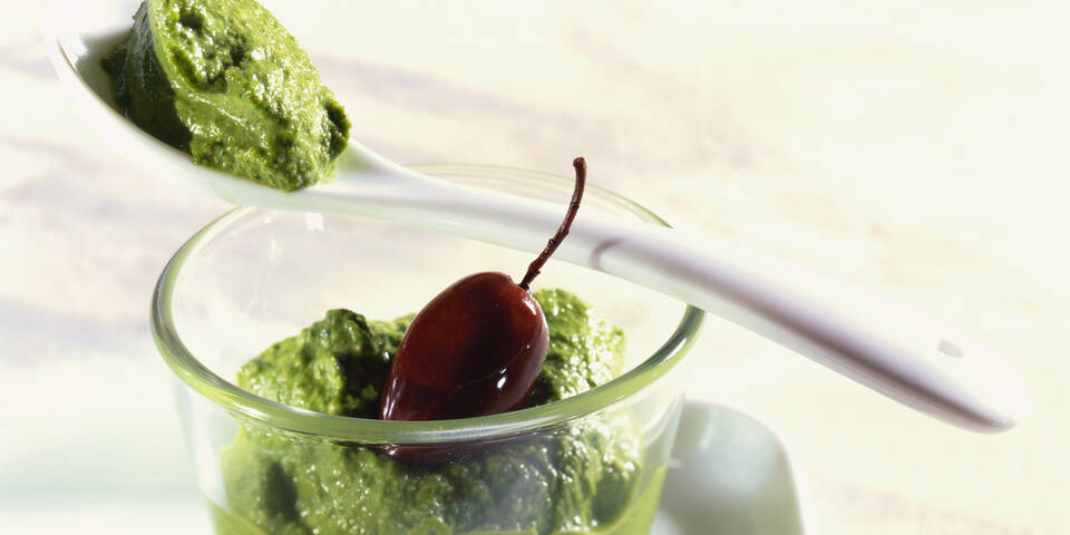 Den Spinat waschen, verlesen, trocknen und einige Blätter im Mörser mit Salz zu einem Brei zerreiben. Weitere Blättchen zugeben und so nach und nach allen Spinat fein zerreiben. Die Pinienkerne zugeben und zerreiben bis sie nur noch kleine helle Punkte sind. Parmesan und Olivenöl unterrühren und mit Salz und Pfeffer abschmecken.