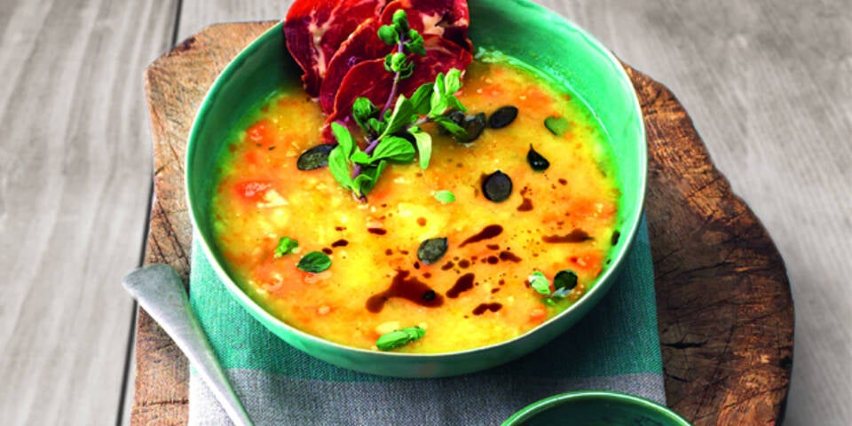 Stampferdäpfelsuppe mit Coppa-Chips und Kürbiskernen