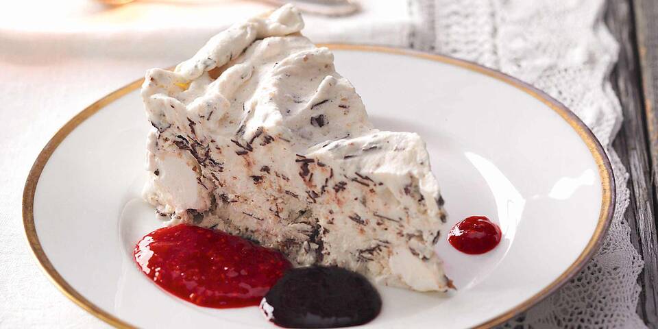 - In die Form füllen und wolkig verstreichen. Mindestens 5 Stunden frieren lassen. Vor dem Servieren aus der Form nehmen, die Folie abziehen und die Eistorte in Stücke schneiden. Dazu nach Belieben Fruchtsaucen reichen.