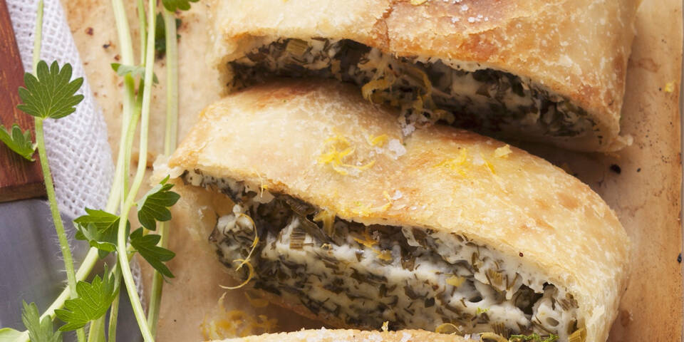 - Den Ofen auf 180 °C Unter- und Oberhitze vorheizen. Den Strudelteig zu einem Rechteck (ca. 30 x 40 cm) ausrollen. Die Kräuter abbrausen, trocken schütteln, abzupfen und grob hacken. Die Zwiebel und den Knoblauch schälen und in 1 EL heißer Butter glasig anschwitzen. Die Kräuter dazu geben und zusammenfallen lassen. Von der Hitze nehmen und abkühlen lassen.