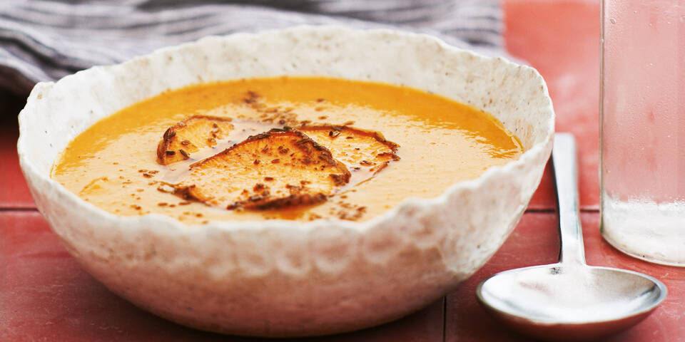 - Die Suppe im Mixer pürieren. Wenn Sie eine ganz feine Textur wünschen, die pürierte Suppe zusätzlich noch durch ein feines Sieb streichen. Die in Tellern angerichtete Suppe mit einigen Korianderblättchen bestreuen.