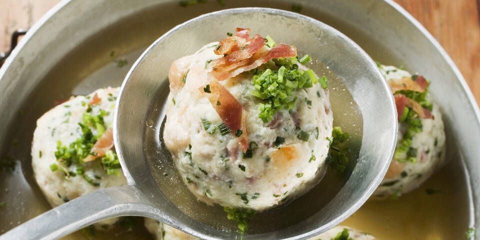 Die Knödel mit einem Schaumlöffel aus dem Wasser heben und abgetropft in eine Suppenterrine geben oder auf Teller verteilen. Die heiße Suppe angießen und die Knödel mit dem übrigen Speck und Schnittlauch bestreut servieren.