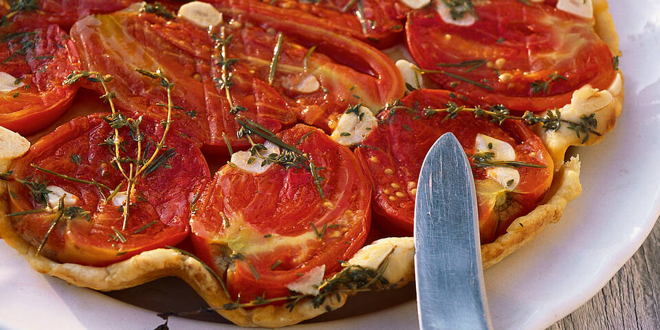 - Mit Olivenöl bepinseln und im heißen Ofen (Mitte) ca. 25 Min. backen, bis der Teig knusprig ist. Tarte vom Rand der Form lösen und stürzen. Heiß oder kalt servieren.
