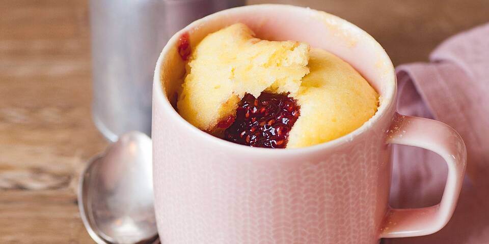 - 40 Sekunden bei 800 Watt in der Mikrowelle backen. Die Konfitüre in die Mitte geben und weitere 50 Sekunden in die Mikrowelle schieben.