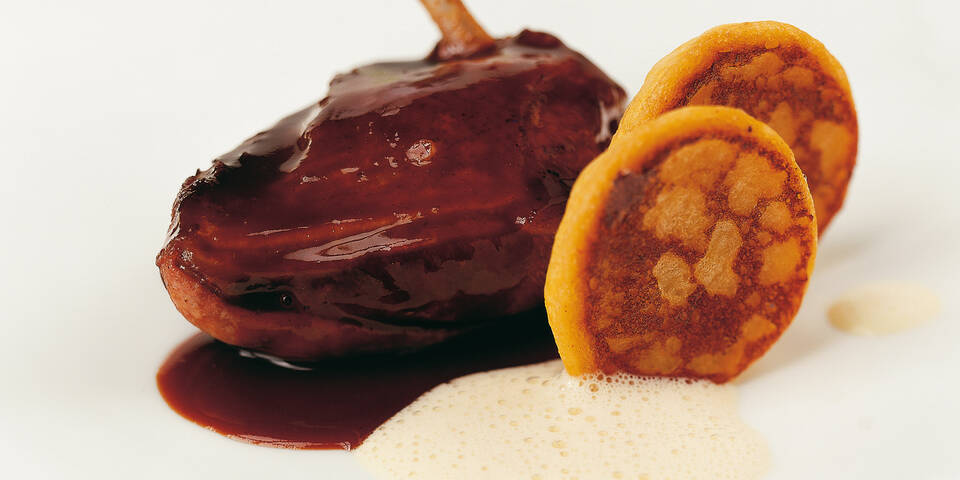 - Das Fleisch mit Salz und Pfeffer würzen und in heißer Butter mit Rosmarin und Thymian rosa braten. Dabei möglichst oft mit der Bratbutter übergießen. Rosa gebratene Taubenbrust mit Erdäpfel-Blini und Barolo-Jus auf Tellern anrichten.