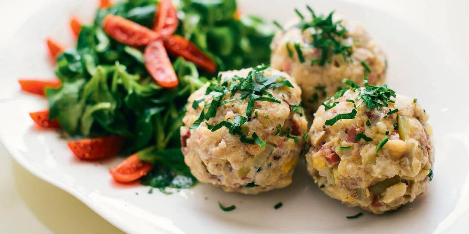 - Die Zwiebel in Butter glasig anschwitzen, dann den Speck dazugeben, rosig werden lassen und zum Schluss die Petersilie hinzufügen. Alles zu der Semmelmasse geben und so viel Mehl beifügen, bis ein weicher Teig entsteht, sodass man daraus gut vier Knödel formen kann.