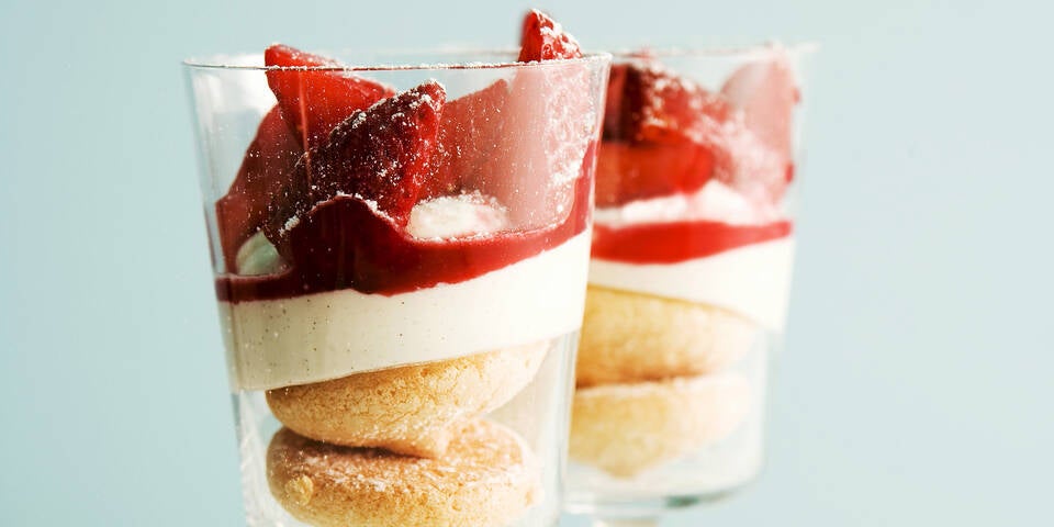 - Die Erdbeeren abbrausen, gut trocken tupfen und klein schneiden. Mit dem Staubzucker vermischen und etwas ziehen lassen. Je zwei Biskuits auf die Gläser verteilen und mit dem Likör beträufeln. Aus der Topfen-Obers-Masse Kreise in Größe der Gläser ausstechen und hineingeben. Die Erdbeeren darauf verteilen und servieren.