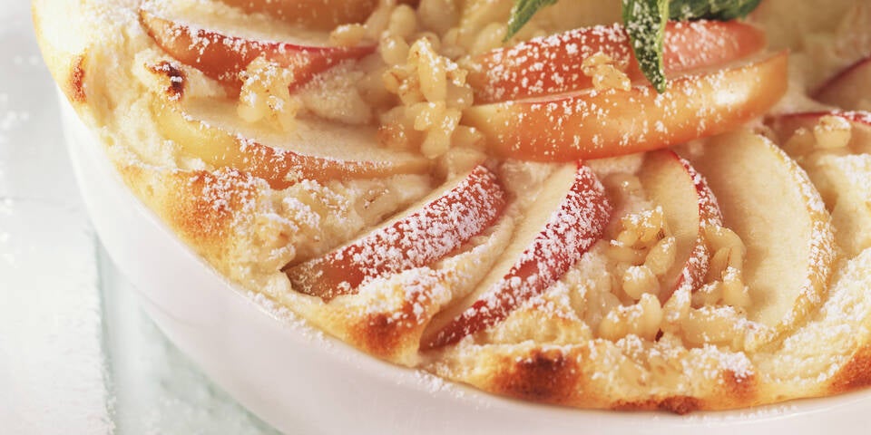 - Die Äpfel waschen, vierteln, die Kerngehäuse entfernen und die Äpfel in Spalten schneiden. Die Eier trennen. Die Eigelbe mit dem Zucker, Vanillezucker und der Zitronenschale mit den Quirlen des elektrischen Handrührgeräts ca. 5 Minuten sehr schaumig rühren. Die Crème fraîche mit dem Topfen und Zartweizen zur Eimasse geben und gut untermischen. Die Eiweiße steif schlagen und mit dem Grieß unter die Auflaufmasse heben. Ca. 2/3 der Auflaufmasse in die Form einfüllen, dachziegelartig mit den Apfelspalten belegen und die übrige Auflaufmasse darauf verteilen.