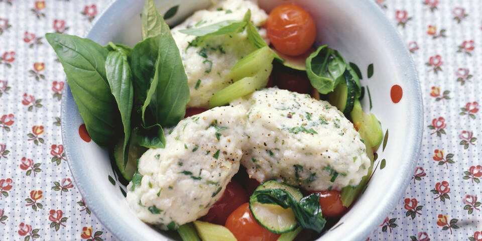 - Aus der Topfenmasse mit zwei angefeuchteten Esslöffeln Nocken formen und in dem siedenden Salzwasser zehn bis zwölf Minuten gar ziehen lassen. Dann abseihen. Währenddessen das Öl in einer Pfanne erhitzen und die Zucchini und den Sellerie darin drei bis fünf Minuten anschwitzen. Die Paradeiser und den Basilikum zugeben, kurz durchschwenken und mit Salz und Pfeffer abschmecken. Das Gemüse in Schüsseln anrichten, die Nocken darauf setzen, mit Pfeffer übermahlen und mit Basilikum garniert servieren.