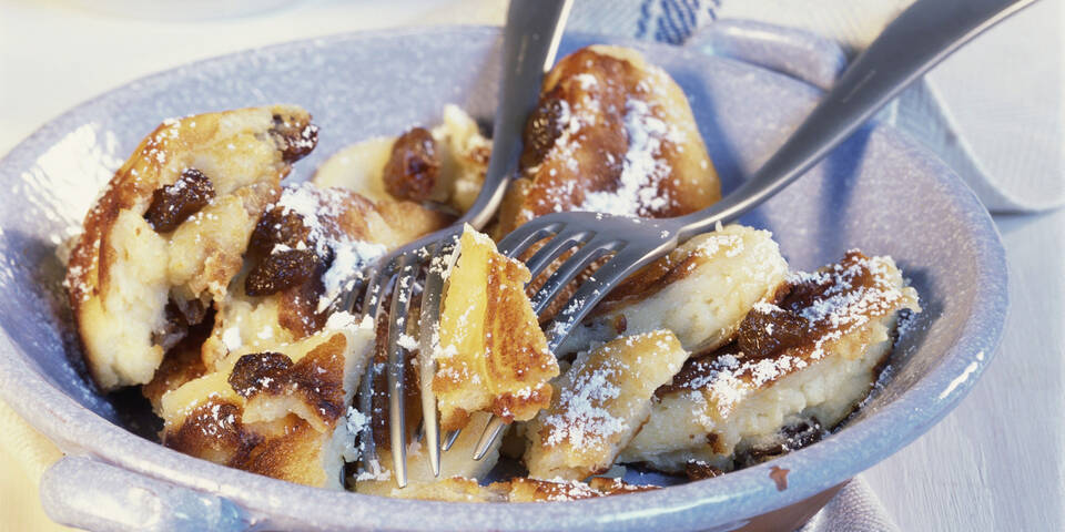 - Den Teig in eine ofenfeste Pfanne mit dem Butterschmalz geben, leicht anbacken lassen, in den Ofen stellen und ca. 10 Minuten goldbraun backen. Anschließend den Schmarren mit zwei Bratwendern oder Gabeln in mundgerechte Stücke reißen, die Butter zugeben und mit Puderzucker bestauben. Alles gut vermengen und zurück auf dem Herd leicht karamellisieren lassen. Auf Tellern verteilen und vor dem Servieren noch mal mit Puderzucker bestauben.