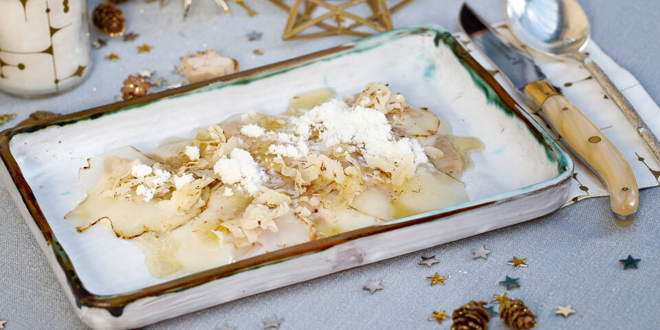 - Für die Topinamburscheiben zuerst die Sherry-Essigmarinade herstellen. Die Rindsuppe mit Walnussöl vermengen, mit Essig, Salz und Sherry abschmecken. Dann die Topinambur dünn auf der Aufschnittmaschine aufschneiden und in der Sherry-Essig-Marniade leicht angaren.