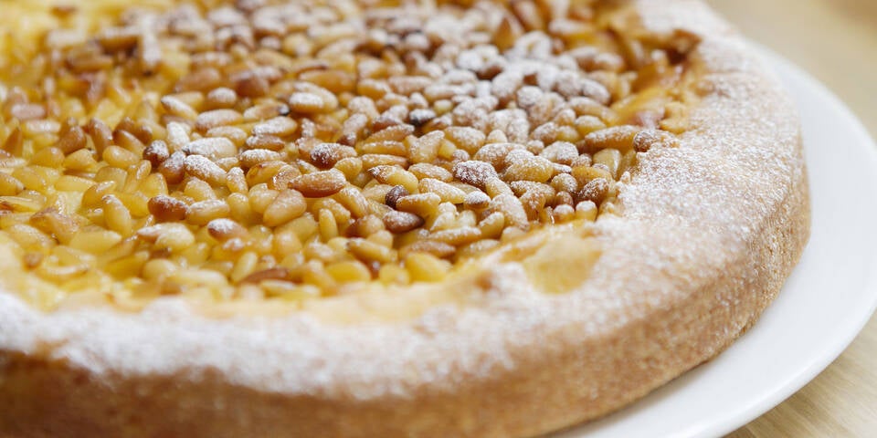 - Mit den Pinienkernen bestreuen und die Teigränder etwas über die Füllung klappen. Im Ofen 40–45 Minuten goldbraun backen. Etwas abkühlen lassen, aus der Form lösen und auf einem Kuchengitter auskühlen lassen. Mit Staubzucker bestaubt servieren.