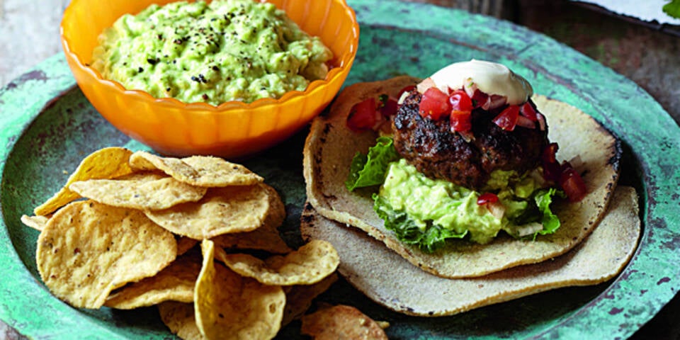 3. In einer weiteren Pfanne die Laibchen im heißen Fett 4–5 Minuten je Seite braten. Mit Guacamole, Salsa, Salat und Tortillafladen anrichten und nach Belieben Nachos dazu reichen.