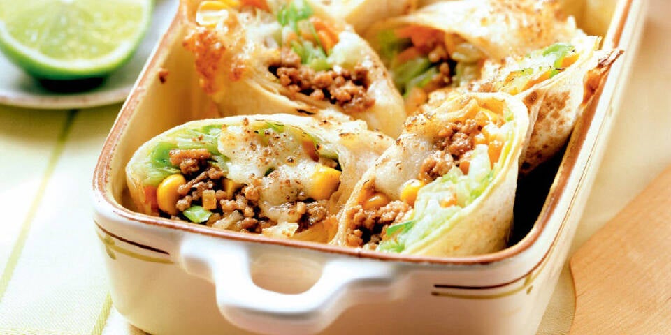 - Die Tortillas mit Sauerrahm bestreichen, salzen pfeffern, die Fleisch-Gemüse-Füllung darauf verteilen und die Tortillas längs einrollen. Quer halbieren, aufrecht in eine gefettete Auflaufform setzen, mit dem Käse bestreuen und im vorgeheizten Backofen zehn Minuten gratinieren.