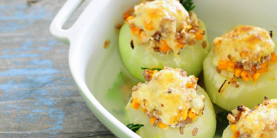 - Den Dinkel mit dem Gemüse, der Hälfte vom Käse und dem Sauerrahm vermischen. Mit Salz und Pfeffer abschmecken. Die Mischung in die Kohlrabis füllen und mit dem restlichen Käse bestreuen. In eine Auflaufform stellen, den Fond angießen und die Kohlrabiblätter dazulegen. Bei 160° C ca. 20 Minuten backen lassen. Nach Belieben mit Paradeiser-Dip servieren.