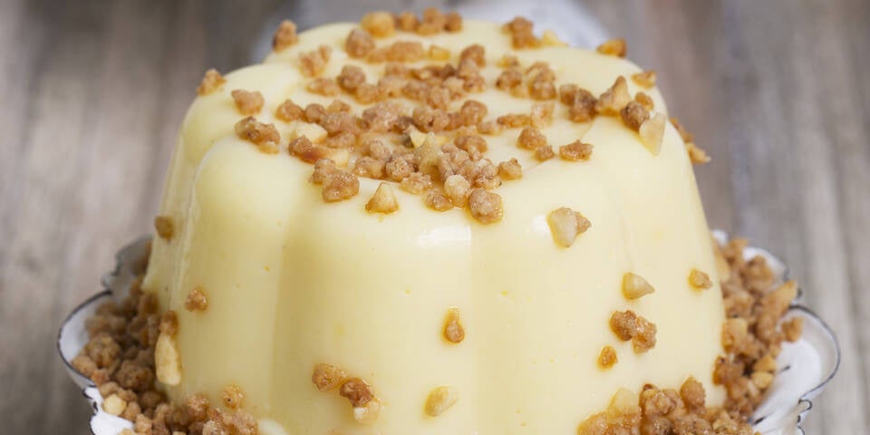 - Mit Klarsichtfolie abdecken, im Kühlschrank mindestens zwei Stunden erkalten lassen. Zum Servieren die Förmchen zu ¾ kurz in warmes Wasser tauchen, auf Teller stürzen. Für eine süß-knusprige Note, den Pudding mit Krokant garniert servieren.