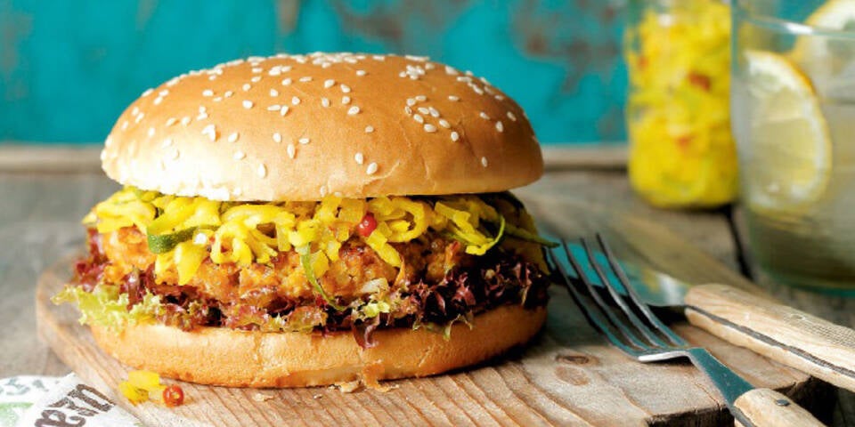 - Währenddessen den Salat waschen und trocken schütteln. Die Hamburgerbrötchen halbieren, den Salat auf die Unterseite legen, die Laibchen draufgeben, mit zwei bis drei Esslöffel Relish bedecken und Brötchenoberseite auflegen. Übriges Relish dazu servieren.