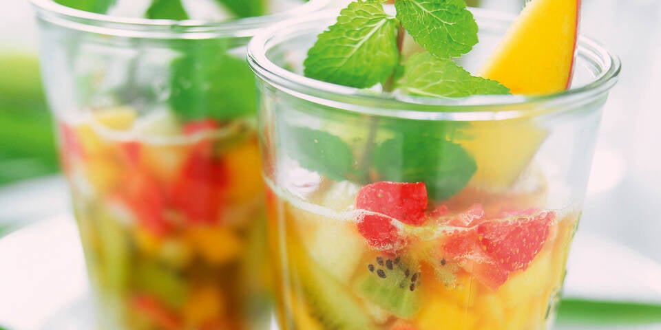 - Zum Servieren die Bowle mit Mineralwasser auffüllen. Das Bananenpüree als Erstes in die Gläser geben und vorsichtig mit der Bowle auffüllen. Die Minze waschen, trocken schütteln und die Gläser damit garnieren. Nach Belieben kann das Mineralwasser auch durch Sekt ersetzt werden.