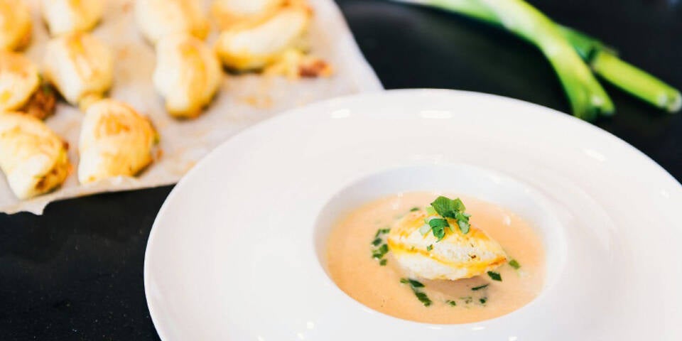 - Rösten Sie für die Füllung die Zwiebel glasig an und kochen Sie die Kartoffeln. Wenn die Kartoffeln kochen, geben Sie Milch und Butter dazu, so viel, bis eine sämige Masse entsteht. Verarbeiten Sie das Ganze zu Kartoffelpüree. Nun kommen die Grammeln und der Schnittlauch hinzu. Würzen Sie alles mit Salz und Pfeffer.