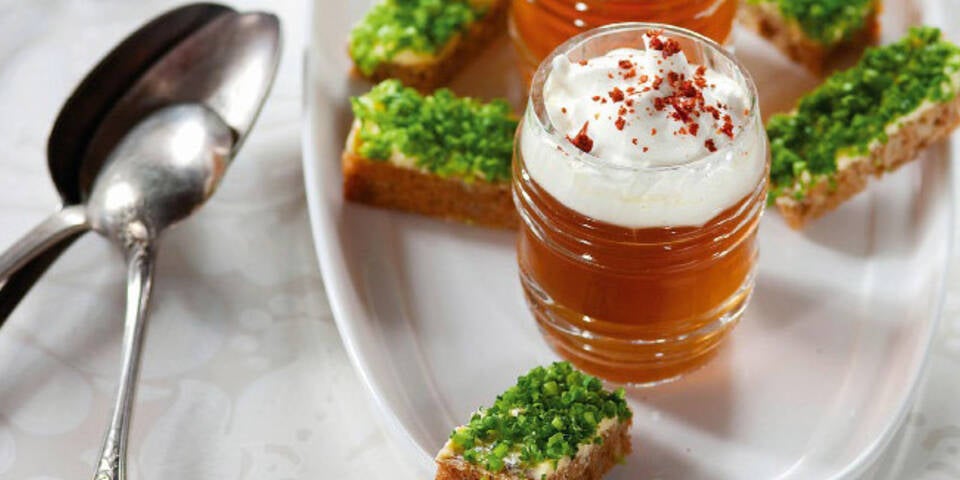 - Wild-Essenz durch ein sauberes Stofftuch in einen anderen Topf gießen, um die Hälfte einkochen lassen, dann kräftig mit Salz und Pfeffer abschmecken und in kleinen Tassen verteilen. Je einen großzügigen Klacks halbsteifen Wodka-Obers darauf verteilen und mit Chiliflocken bestreut servieren. Dazu die Schnittlauch-Brotschnitten reichen.