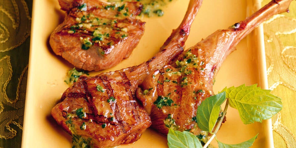 - Die Koteletts rund fünf Minuten ruhen lassen. Danach auf Tellern anrichten, mit der würzigen Soße beträufeln und servieren.