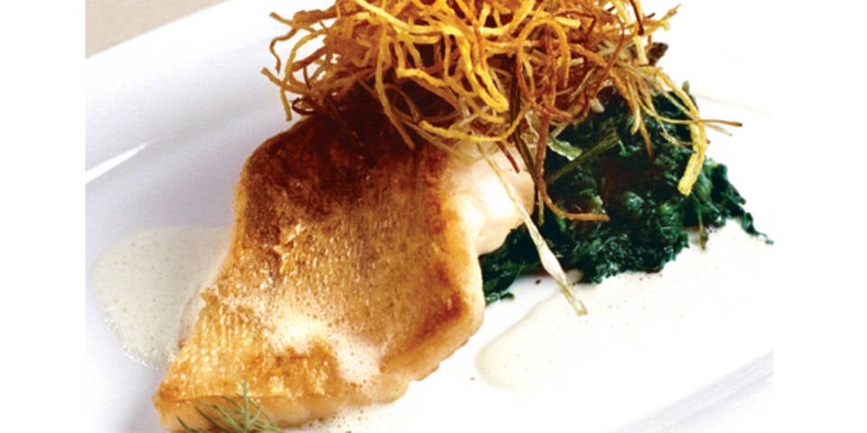 - Creme erhitzen und mit Spinat vermengen. Spinat auf Teller setzen, Zanderfilets darauf anrichten. Mit Gemüsestroh dekorieren.