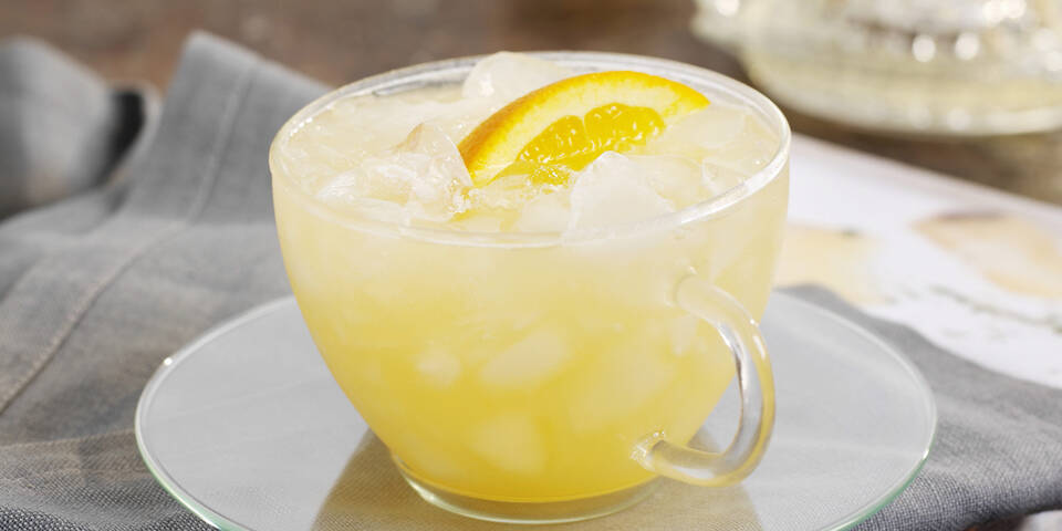 - Die Orange auspressen und mit dem abgekühlten Tee vermischen. Das crushed ice auf Tassen verteilen und mit dem Eistee aufgießen. Nach Belieben mit einer Orangenspalte garniert servieren.