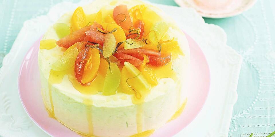 - Eine Springform mit Frischhaltefolie ausschlagen. Die Limetten und Zitronen heiß waschen und trocken reiben. Die Schale in Zesten abziehen. Einige Limettenzesten zum Garnieren beiseitelegen.