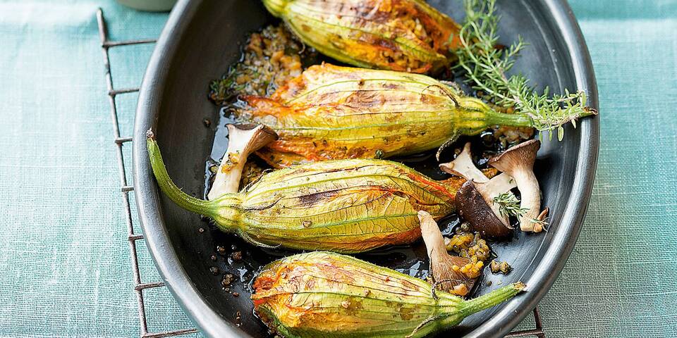 - Den Ofen auf 180 °C Unter- und Oberhitze vorheizen. Vier Portions-Backformen (oder eine große Backform) mit Öl auspinseln. Den Stempel und die Staubgefäße im Inneren der Blüten entfernen. Bulgur in die Blüten füllen und die Spitzen zusammendrehen. Je 4 Stück in jede Form legen.