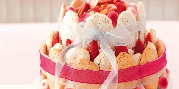 Zutaten Für den Biskuit: Pflanzenöl und Mehl, für die Form 6 Eier, 1 Prise Salz, 150 g Zucker 1 EL Vanillezucker 1 Msp Zitronenabrieb, unbehandelt 150 g Mehl, 1 TL Backpulver 2 EL Speisestärke Für die Creme: 200 g Erdbeeren, 100 g Puderzucker 8 Blatt Gelatine, 250 g Topfen 400 g Nonno Nanni Frischkäse, 500 ml Obers 1 Zitrone, Saft und Abrieb rote Lebensmittelfarbe Erdbeeren, zum Garnieren