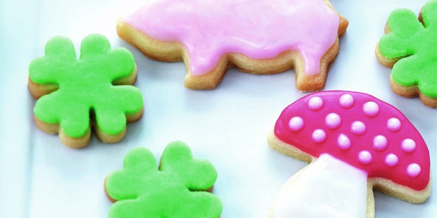 2. Den Backofen auf 180°C Umluft vorheizen. Ein Backblech mit Backpapier belegen. Den Teig auf bemehlter Arbeitsfläche ca. 3 mm dünn ausrollen. Nach Belieben Sylvester-Motive wie Kleeblätter, Schweinchen und Fliegenpilze ausstechen und auf das Backblech legen. Im Backofen (Mitte) ca. 12 Minuten goldgelb backen. Die Kekse vorsichtig auf ein Kuchengitter setzen und auskühlen lassen.