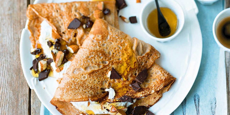 4. Zum Anrichten die Crêpes jeweils mit Topfen bestreichen, falten und mit der restlichen gehackten Schokolade und den Mandeln bestreuen. Nach Belieben mit flüssigem Honig beträufelt servieren.