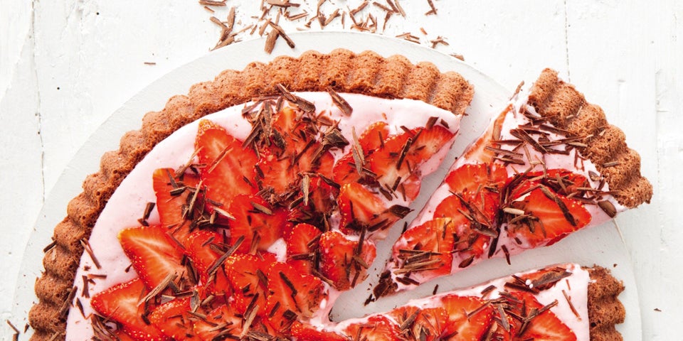 Zubereitung 1. Den Backofen auf 180 °C Ober- und Unterhitze vorheizen. Die Kuchenform ausbuttern und mit Kakao ausstreuen. Überschüssigen Kakao herausklopfen. Das Mehl mit Mandeln und Kakao mischen. Die Eier in eine Rührschüssel geben. 2. Den Zucker und das Salz zugeben und bei höchster Stufe ca. 5 Minuten zu einer dick-cremigen Masse aufschlagen. Dann die Mehlmischung zugeben und locker unterheben. In die Form geben, glatt streichen und im Ofen 12–15 Minuten backen. Abkühlen lassen, aus der Form lösen und auf einem Kuchengitter erkalten lassen. 3. Für den Belag die Erdbeeren waschen, trocken tupfen, putzen und ca. 200 g klein schneiden. Mit 1 EL Staubzucker in einen Mixbecher geben und fein pürieren. Das Erdbeerpüree durch ein feines Sieb streichen, dabei das Erdbeermark auffangen. 4. Die Gelatine ca. 10 Minuten in kaltem Wasser einweichen. Den Topfen mit dem übrigen Staubzucker, Vanillezucker und Zitronenabrieb glatt rühren. Das Obers steif schlagen. 5. Die Gelatine gut ausdrücken und in einem Topf bei kleiner Hitze schmelzen lassen. 3–4 EL Erdbeermark einrühren, dann die Gelatine unter den Topfen rühren. Das übrige Erdbeerpüree unterrühren und das Obers unterheben. Etwa 30 Minuten im Kühlschrank anziehen lassen. 6. Übrige Erdbeeren in dünne Scheiben schneiden. Die Schokolade raspeln. Den Kuchenboden auf eine Platte legen und mit der Erdbeercreme bestreichen. Die Erdbeeren dekorativ darauf legen und bis zum Servieren kalt stellen. Zum Garnieren mit der Schokolade bestreuen.