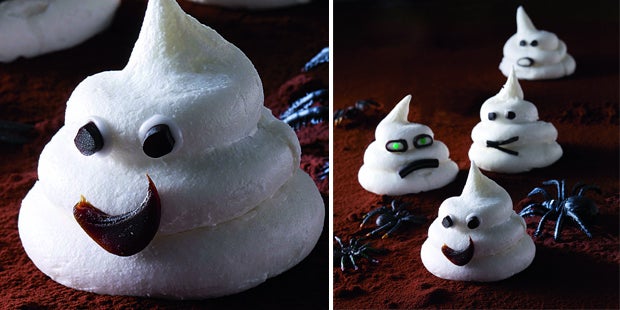 2. Auf einem mit Backpapier ausgelegten Backblech 15–20 Geister aufspritzen. Im vorgeheizten Backofen ca. 4 Stunden trocknen lassen, dabei die Ofentür einen Spalt geöffnet lassen. Danach im geöffneten Ofen auskühlen lassen.