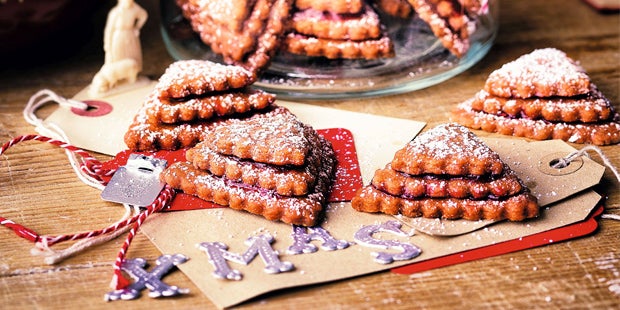 Dauer: 40 min Schwierigkeit: leicht Portionen: ca. 25–30 Stück Zutaten ca. 300 g Mehl 200 g gemahlene Mandeln 1 EL Kakaopulver 1 TL Backpulver 100 g feiner, brauner Zucker 50 g Vanillezucker ½ TL Zitronenabrieb 1 Ei 1 Eidotter 300 g kalte Butter Mehl, zum Arbeiten ca. 250 g Himbeermarmelade oder -gelee Staubzucker, zum Bestauben Zubereitung 1. Mehl zusammen mit den Mandeln, dem Kakao, dem Backpulver, dem Zucker, dem Vanillezucker und Zitronenabrieb auf der Arbeitsfläche häufeln, eine Mulde eindrücken, das Ei mit dem Eidotter hineingeben, die Butter in Flöckchen rundherum verteilen. 2. Alles mit einer Teigkarte durchhacken. Die Brösel mit den Händen rasch zu einem geschmeidigen Teig verkneten. Nach Bedarf noch ein wenig kaltes Wasser oder Mehl zufügen. In Frischhaltefolie gewickelt für ca. 1 Stunde in den Kühlschrank stellen. 3. Backofen auf 180 °C Umluft vorheizen. Zwei Backbleche mit Backpapier auslegen. Den Teig auf bemehlter Arbeitsfläche dünn ausrollen. Mit drei verschieden großen Ausstechern in jeweils gleicher Menge Dreiecke (mit Wellenrand) aus dem Teig ausstechen, auf die Backbleche setzen und im Ofen ca. 12 Minuten leicht hellbraun backen. 4. Die Kekse noch heiß mit einer Palette auf ein Kuchengitter setzen. Die beiden größeren Kekse noch heiß mit glatt gerührter Marmelade bestreichen und zusammensetzen, das Kleinste oben aufsetzen. Mit Staubzucker bestauben und auskühlen lassen. |
