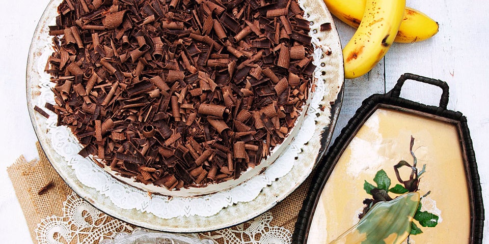 Dauer: 45 min + 4 h Kühlen Schwierigkeit: mittel Portionen: 1 Form, 24 cm Zutaten Für den Boden: 150 g Butterkekse 100 g Zartbitterkuvertüre 50 g Butter 50 g gehackte Mandeln,geschält Für die Creme: 6 Blatt Gelatine 3–4 Bananen 1 Zitrone, Saft 4 EL Birnendicksaft 250 g Frischkäse 500 g Magertopfen 100 g Staubzucker 200 ml Obers Zum Verzieren: 150 g Raspelschokolade, Zartbitter Zubereitung 1. Die Kekse in einen Gefrierbeutel füllen und mit einem Nudelholz grob zerbröseln. Die Kuvertüre hacken und mit der Butter über einem heißen Wasserbad schmelzen. Leicht abkühlen lassen und die Kekse mit den Mandeln untermengen. 2. Einen Tortenring auf eine Kuchenplatte stellen, mit Frischhaltefolie ausschlagen und die Mischung für den Boden darauf verteilen, gleichmäßig glatt streichen und in den Kühlschrank stellen. 3. Für die Creme die Gelatine in kaltem Wasser einweichen. Die Bananen schälen, in Scheiben schneiden und mit dem Zitronensaft vermengen. Den Dicksaft leicht erwärmen und die ausgedrückte Gelatine darin auflösen. 4. Den Frischkäse mit dem Topfen und dem Staubzucker glatt rühren und 4–5 EL davon unter die gelöste Gelatine rühren. Anschließend unter die restliche Creme rühren. 5. Das Obers steif schlagen und unterziehen. Die Bananen vorsichtig unterheben, die Masse auf den Boden füllen und glatt streichen. Mindestens 4 Stunden kaltstellen. 6. Die Torte aus der Form lösen, die Folie abziehen, mit den Schokoraspeln bestreuen und in Stücke geschnitten servieren. |