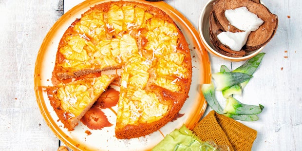 Dauer: 1 h 30 min Schwierigkeit: leicht Portionen: 1 Form, 24 cm Zutaten weiche Butter und Brösel, für die Form 275 g weiche Butter 200 g Zucker 1 EL Vanillezucker 1 Prise Salz 1 Msp unbehandelter Zitronenabrieb 4 Eier 300 g Mehl 100 g Speisestärke 75 g gemahlene Haselnüsse 75 g Kokosraspel 1 TL Backpulver Ca. 120 ml Kokosmilch 1 mittlere Ananas 1 EL brauner Zucker Zubereitung 1. Den Ofen auf 180 °C Unter- und Oberhitze (oder 160°C Umluft) vorheizen. Die Springform mit Butter auspinseln und mit Bröseln ausstreuen. 250 Butter cremig rühren und den Zucker einstreuen. Den Vanillezucker, das Salz und den Zitronenabrieb sowie unter Rühren die Eier nach und nach ergänzen. 2. Das Mehl mit der Stärke, den Nüssen, der Hälfte der Kokosraspel und dem Backpulver vermischen und abwechselnd mit der Kokosmilch unter die Eierbutter rühren, bis ein geschmeidiger, schwer reißender Teig entstanden ist. Den Teig in die vorbereitete Backform füllen und glatt streichen. 3. Die Ananas schälen, längs vierteln, den Strunk herausschneiden und die Viertel in Scheiben schneiden. Fächerartig auf dem Teig verteilen, mit der restlichen Butter in Flöckchen belegen, mit dem braunen Zucker und den übrigen Kokosraspeln bestreuen. 4. Im Ofen ca. 50 Minuten goldbraun backen (Stäbchenprobe). Sollte der Kuchen zu dunkel werden, mit Alufolie abdecken. Aus dem Ofen nehmen und in der Form auskühlen lassen. |