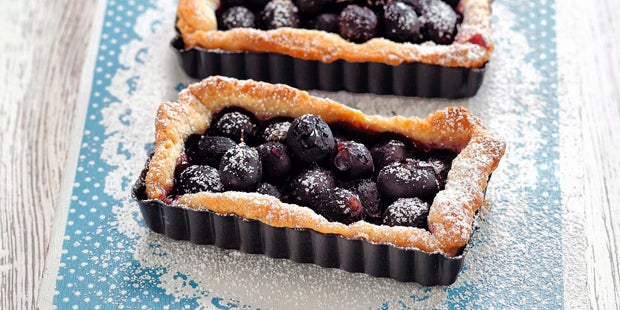 Dauer: 55 min + 1 h Kühlen Schwierigkeit: leicht Portionen: 6 Zutaten Für den Teig: ca. 300 g Mehl 75 g gemahlene Mandeln 1/2 TL Backpulver 100 g Zucker, 1 Prise Salz 1 Ei, 200 g kalte Butter Butter und Mehl,für die Förmchen Mehl, zum Arbeiten Für den Belag: 100 g Frischkäse 2 EL Puderzucker 1 EL Speisestärke 1/2 TL Zitronenabrieb 200 g dunkle Weintrauben Puderzucker, zum Bestauben Zubereitung 1. Das Mehl mit Mandeln, Backpulver, Zucker und Salz vermischen. Auf die Arbeitsfläche häufeln und in die Mitte eine Mulde eindrücken. Das Ei hineingeben. Die Butter in Stücke schneiden und auf dem Mehlrand verteilen. Mit einem großen Messer alle Zutaten krümelig hacken. Anschließend rasch mit den Händen zu einem geschmeidigen Teig verkneten. 2. Falls nötig, noch etwas kaltes Wasser oder Mehl zufügen. Zu einer Kugel formen und in Frischhaltefolie gewickelt, im Kühlschrank ca. eine Stunde ruhen lassen. Den Backofen auf 180 °C Ober- und Unterhitze vorheizen. Den Frischkäse mit dem Puderzucker, der Speisestärke und Zitronenabrieb verrühren. 3. Den Teig in sechs gleich große Portionen teilen und in Größe der Förmchen ausrollen. Die gebutterten Förmchen damit auskleiden und dabei einen Rand hochziehen. Mit der Frischkäsecreme bestreichen, die Weintrauben waschen, trocken tupfen und darauf verteilen. Im vorgeheizten Ofen ca. 25 Minuten backen. Herausnehmen, auskühlen lassen und mit Puderzucker bestaubt servieren. |