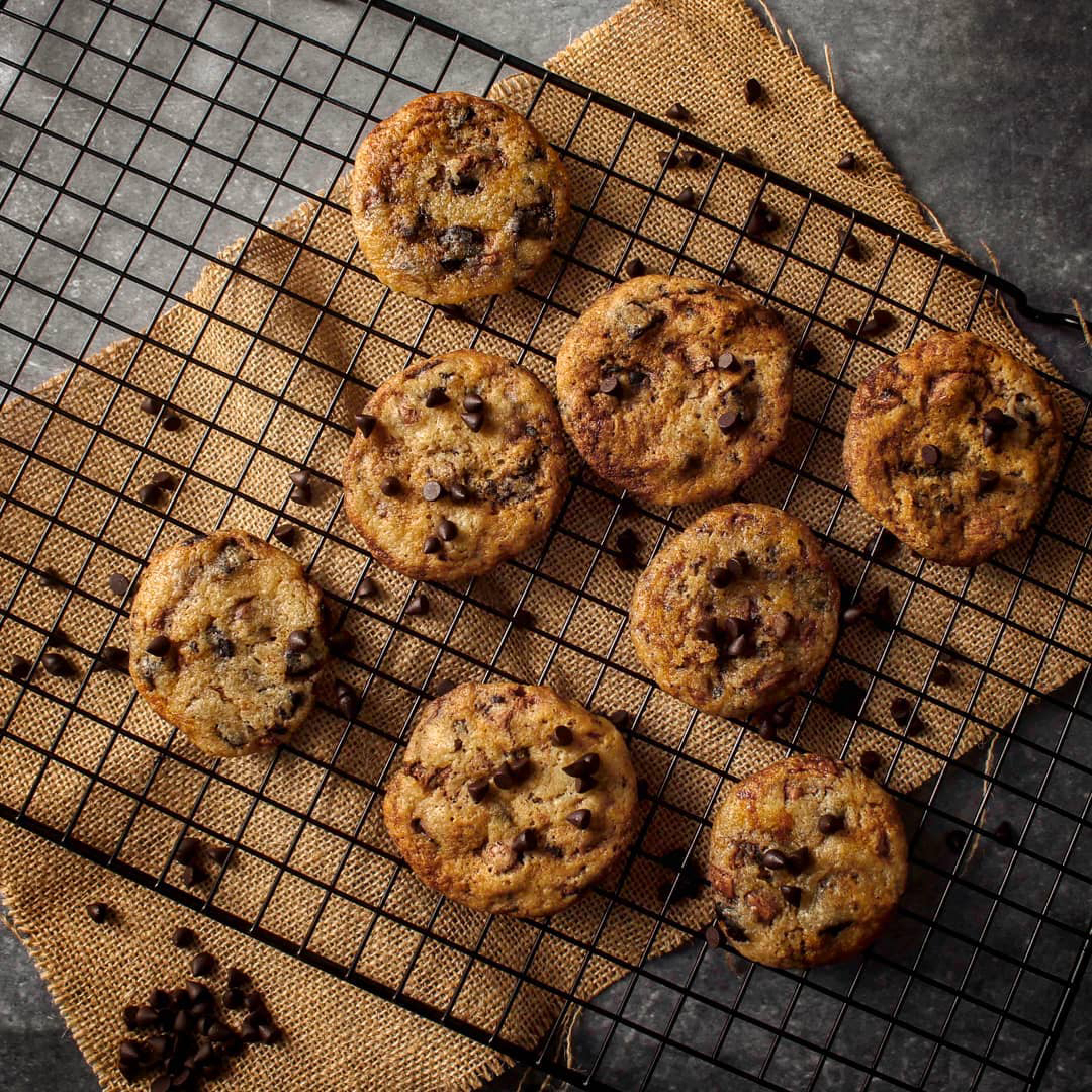 3. Von der Masse mit einem Eisportionierer oder Löffel 6-8 Kugeln abstechen, mit ausreichend Abstand zueinander auf das Backblech setzen und flach drücken. Die Cookies im Ofen 12-13 Minuten backen, bis die Ränder leicht bräunen. Herausnehmen und auf dem Blech vollständig auskühlen lassen.