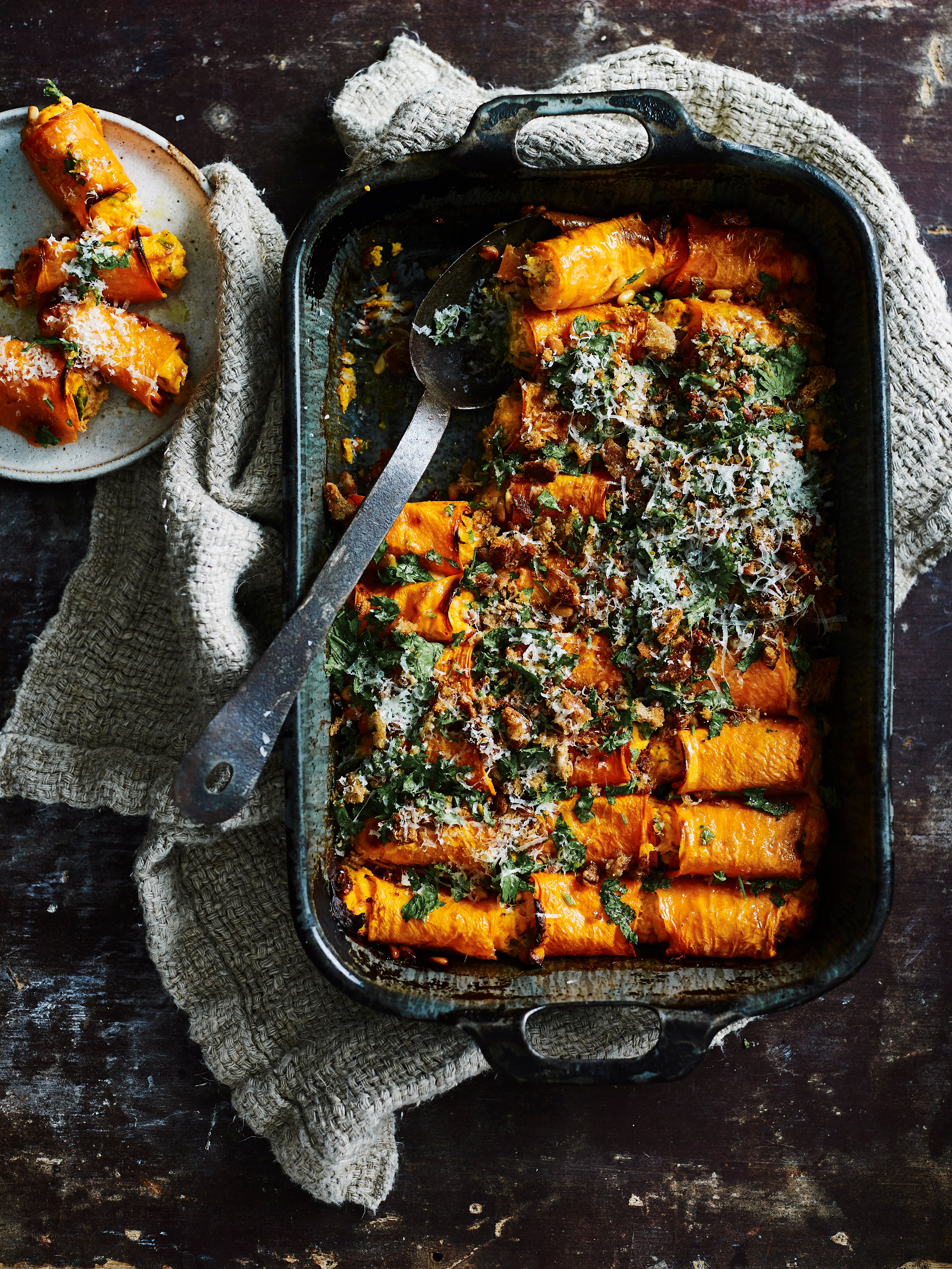- Je etwas von der Ricottamasse auf die Süßkartoffelscheiben geben, aufrollen und nebeneinander in die Auflaufform legen. Die Bröselmischung darüberstreuen, mit Olivenöl beträufeln und im Ofen ca. 20 Minuten überbacken. Aus der Form servieren.