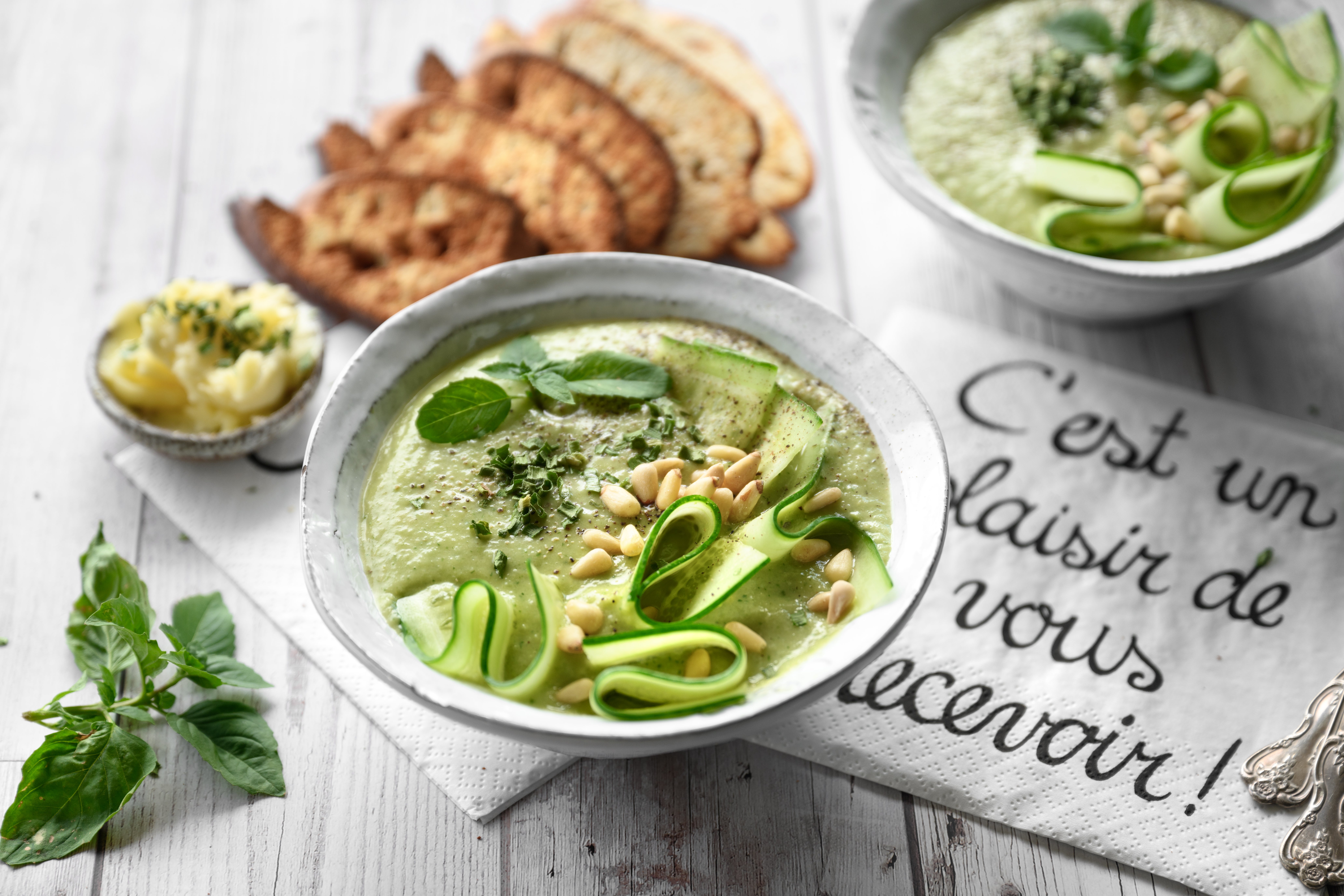 Alle Zutaten in einen Mixer geben, bis eine glatte, cremige Konsistenz entsteht. Mindestens eine Stunde kaltstellen und vor dem Servieren gut durchziehen lassen. Garnieren kann man das Ganze mit frischen Kräutern wie Minze oder Basilikum.