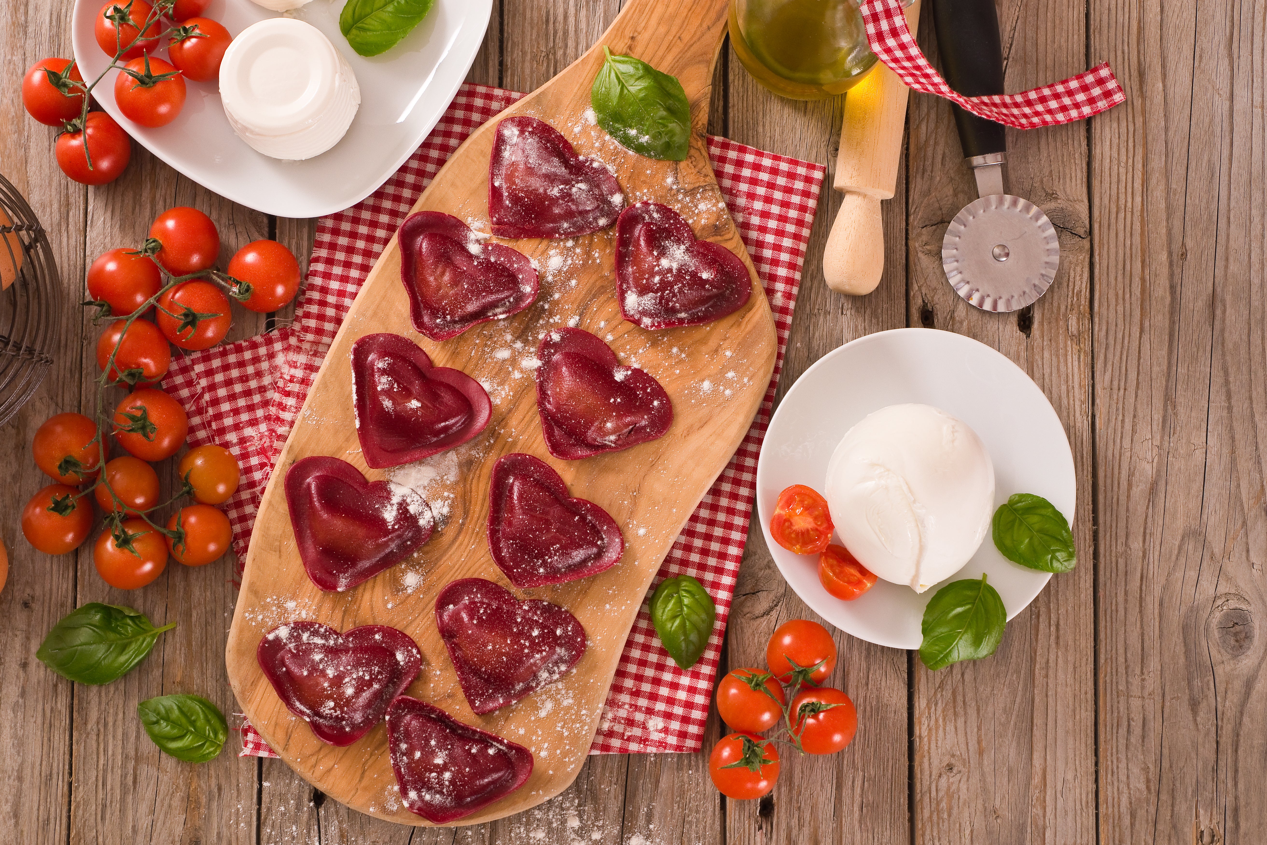 - Den Teig portionsweise mit der Nudelmaschine oder auf einer bemehlten Arbeitsfläche zu dünnen Bahnen ausrollen und mit einem Herz-Ravioliformer 5-6 cm große Herzen ausstechen. Das Ei verquirlen und die Teigränder damit bestreichen.