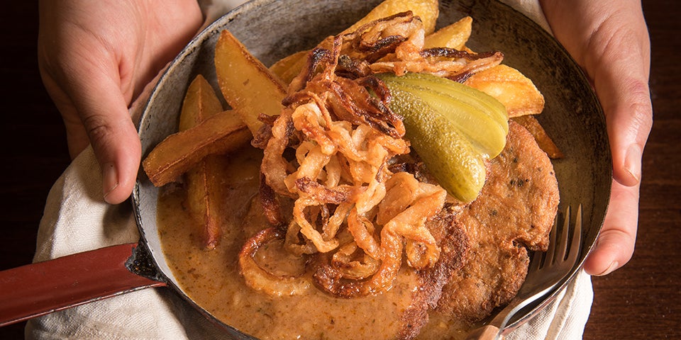 Veganer Zwiebelrostbraten mit Bratkartoffeln