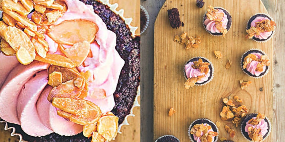 1. Muffins: Den Backofen auf 175 °C vorheizen. Die Roten Rüben fein reiben. Etwas des dabei entstehenden Safts für das Frosting zur Seite stellen. Die Schokolade klein hacken und über einem heißen Wasserbad schmelzen. Die Schokolade vom Wasserbad nehmen, das Kokosöl zufügen und verrühren. Eier, Kokoszucker, Agavensirup und Vanillepulver mit dem Handrührgerät zu einer schaumigen Masse rühren. Die Schokolade zugeben. Vorsichtig die gemahlenen Mandeln mit dem Backpulver, Kakao und Salz unterrühren. Die Muffinförmchen etwa zur Hälfte mit dem Teig füllen. Auf der mittleren Schiene etwa 20 Minuten backen. Abkühlen lassen.