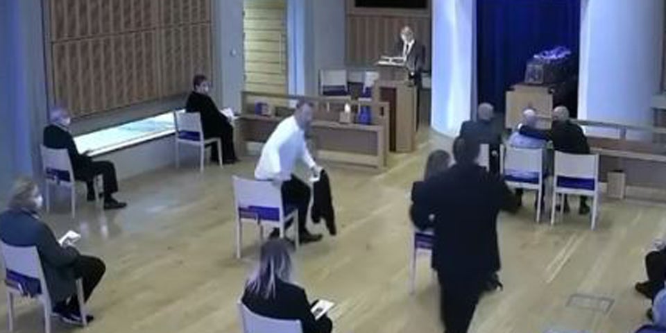 Bei einer Trauerfeier im englischen Milton Keynes mussten die Teilnehmer wegen der Corona-Pandemie zwei Meter Abstand halten. Als der Sohn seine weinende Mutter – die Witwe – trösten will, tritt ein Mitarbeiter des Krematoriums auf und verhindert das.